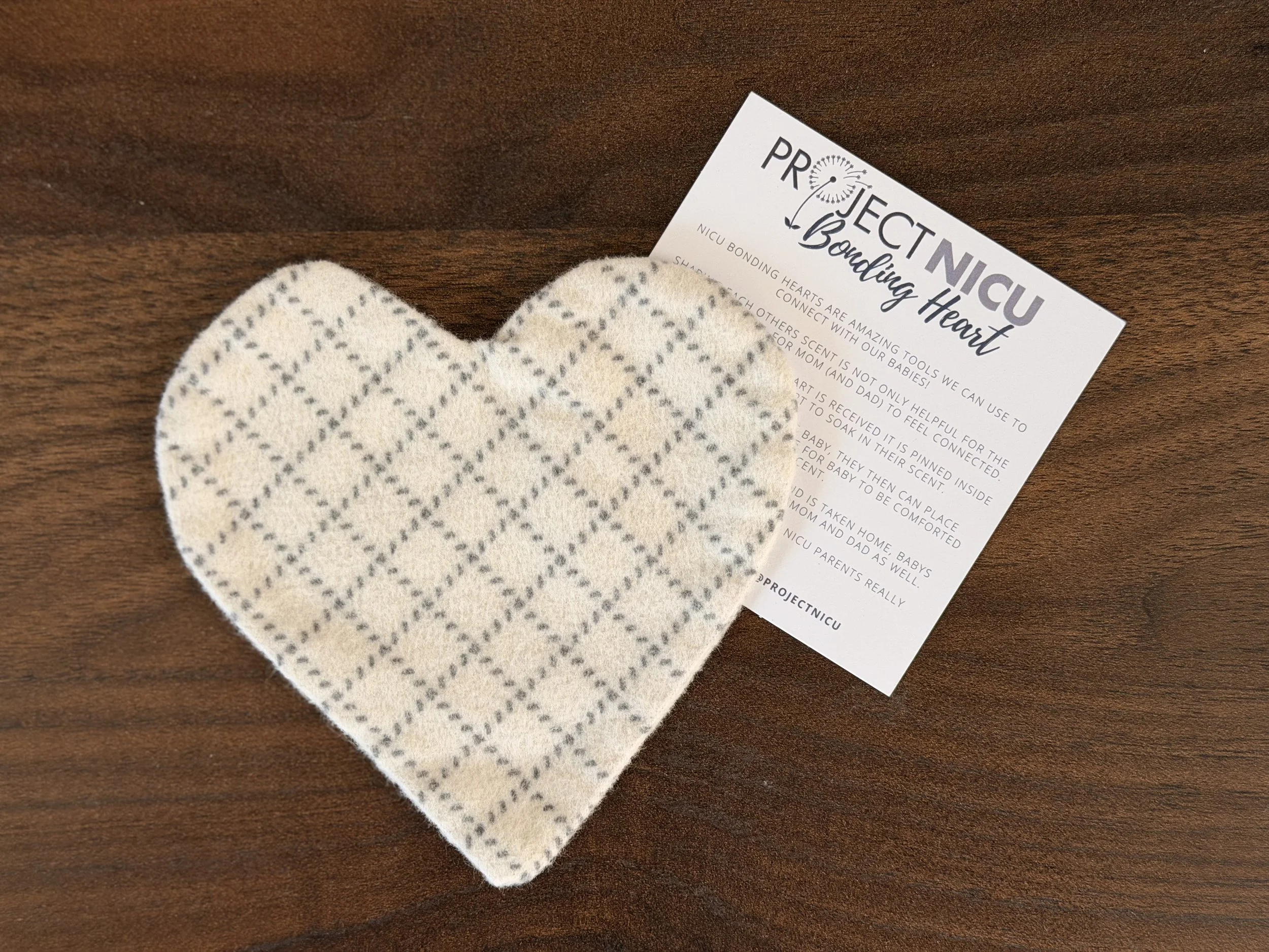 Bonding Hearts are an amazing way for parents and babies to bond while a child has a NICU stay. Mothers and fathers may wear a heart inside a shirt for a time and then the hearts are taken to the NICU and placed in the isolette with the baby. This allows the baby to smell and bond with the parents in such a sweet way.